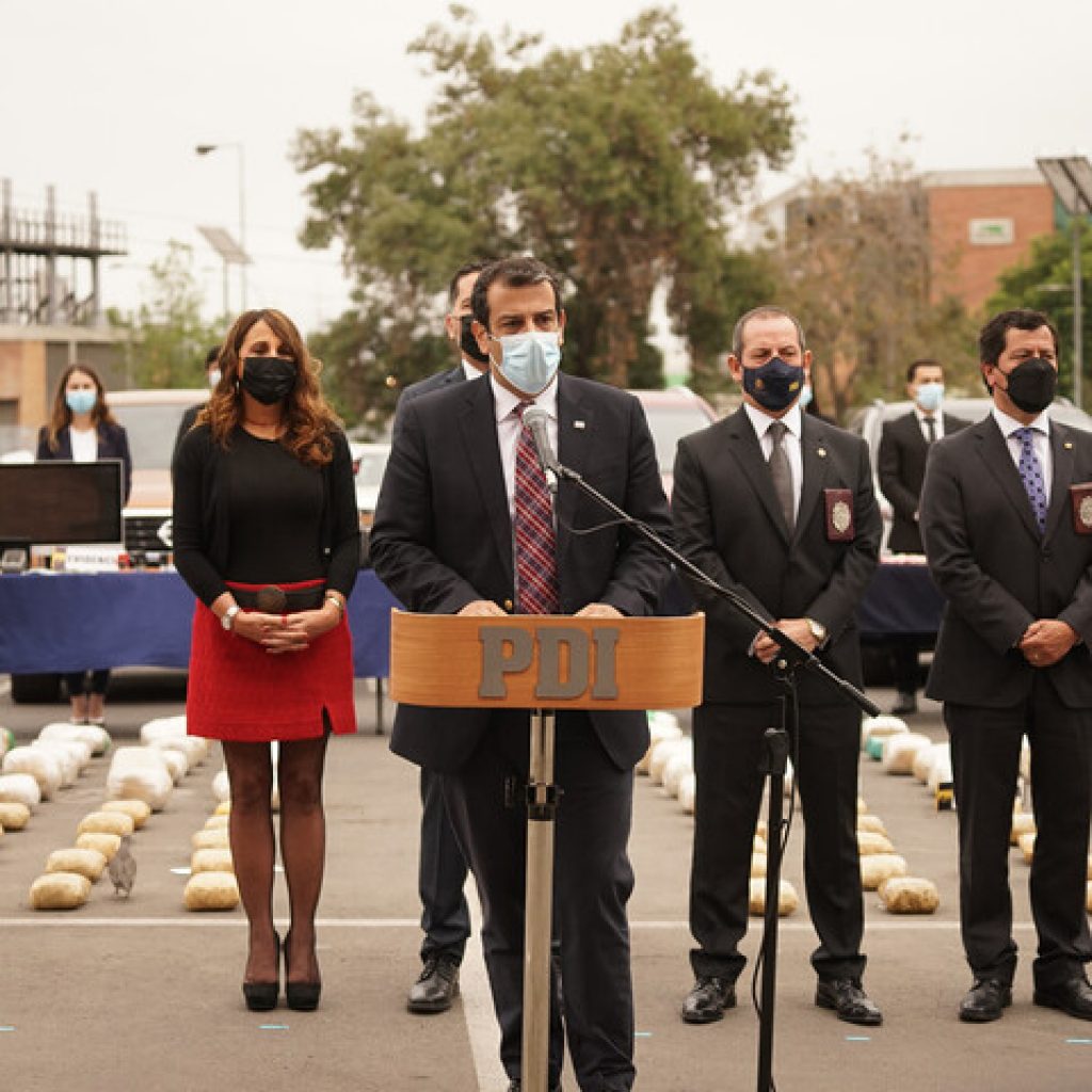 El ministro del Interior, Rodrigo Delgado, junto al director general de la PDI, Sergio Muñoz, y la subsecretaria de Prevención del Delito, María José Gómez, informaron este lunes sobre una investigación que permitió desbaratar una organización de narcotráfico, en donde se incautaron más de 200 kilos de distintas drogas.